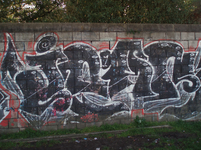 Díptico al costado de J. M. Paz cerca de Santa Rosa. Está firmado por el grupo grafitero Isqer. La sigla ONP quiere decir "Oeste No Problem", tal como dice en otro grafiti de la zona. Hay un fantasma que sale de una lápida, acosa a "Joan" y le tira unos rayos rojos (capaz que no lo acosa pero tiene cara fiera). Si se refiere a lo que sospecho, ¿qué culpa tiene la política anarquista por la muerte de Demetrio Szachraj? ¿Y porqué no me lo dijeron en la cara, o poniendo bien nuestros nombres? Burlarse en grupo de un inválido es muy de garcas, y así no asumen bien su propia culpa. Si no me equivoco, van a tener que convencerse a sí mismos de no tenerla, y no les va a salir del todo porque promovieron nuestro enfrentamiento. De todas formas, creo que me equivoco en algo al interpretar así al mural, y por ende en mis conclusiones.
